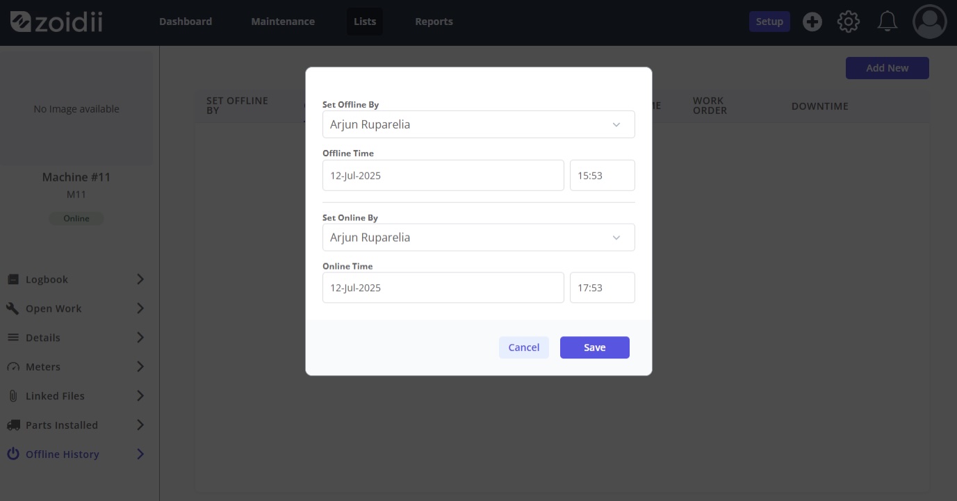 Zoidii doesn’t offer automatic downtime tracking, but you can manually log equipment downtime using the “Offline History” section in the asset card.
